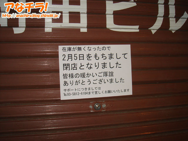 PCパーツショップ「ワンネス」が2月5日(月)に正式閉店した。同店は1月31日に閉店する予定だったが「まだ在庫がある」という理由で営業していた。最後まで商魂たくましいところが老舗のPCパーツ系ショップらしい。 一度閉店予定を出していたのに営業を延長していたので、今回は店頭POPに「在庫が無くなったので閉店」「商品が無くなってきた為本日で閉店(今度こそ本当に)」「ザ・閉店」「今日が最後」「本日閉店」といった過剰なまでに閉店のお知らせをだしていた。 ちなみに、閉店後に「本日で閉店の為、このケースご自由にお持ち下さい」と書かれたジャンクケースがシャッター前に置かれていたのには哀愁が漂っていた。 □関連記事 (k)