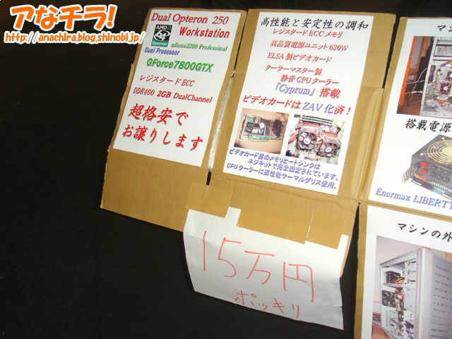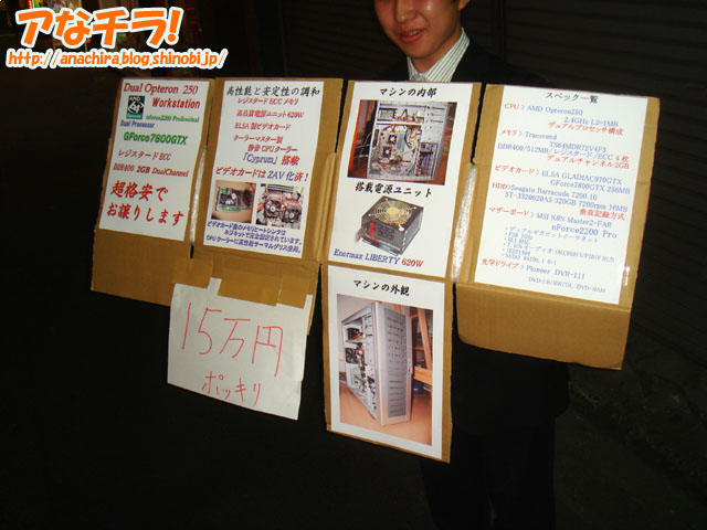 昼の2時から売っているが、買ってくれる人は現れなかったらしい。看板(昨晩徹夜して自作)はかなり良い出来で人目を引くのだが、静かにたたずんでいるのがネックだったのかもしれない。通行人に向かって気軽に「安いパソコンいかがですか?」と声をかけていたら状況は変わっていたかもしれない。