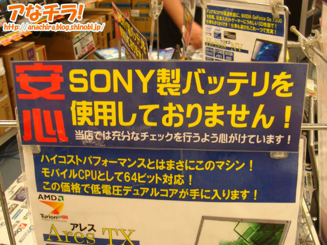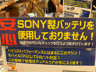 昨今、パソコン業界ではSONY製バッテリーに発火の恐れがある事が話題だ。ユーザーもそこら辺は気にしているのか、パソコンを買う時にショップの店員さんに「このバッテリー燃え出します?」と聞いているとかいないとか、そんな世間に風評に最初からSONY製を使用しておりません!と公表しているPOP。提示しているのはサードウェーブ。 POPには十分なチェックを行うよう心がけていますともあるが、どんなチェックをしているのか詳細は書いてない。不安を払拭するためには是非、発火したというDellのノートパソコンと同じように、カンファレンス会場で大勢の記者に取材機材として使用テストをしてもらいたいものだ。 株式会社サードウェーブ (k) PR