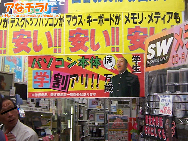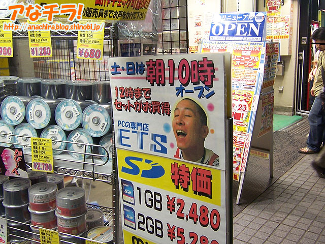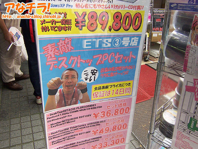 秋葉原のショップといえば、萌え系ショップやパソコンショップに限らず、動物や美少女などかわいいイメージのキャラクターをPOPに書き込むなどして店をアピールするのが普通だ。だが、同じことやっても勝ち目はないと考えたのか、実在店員(と思われる)のおっさんキャラをイメージキャラクターとして使う独自路線のショップもある。 中古パソコン店のETSの店内でPOPを見渡すと、学生服を着たおっさんが「学割アリ!」と叫んでいたり、おっさんが恍惚の表情を浮かべて土日の早朝開店をアピールしていたり、しまいには少女マンガ風に目を光らせて猫のポーズで「安いニャ」とセリフのついたPOPまで登場する。 確かに目をひくが、まぁ今風に言えばキモい。商品の回転と価格が勝負の中古パソコン店にゃ可愛いイメージなんか必要ないって? ETS-TRADE (f) PR