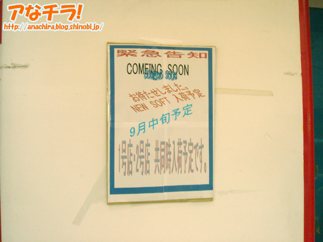 POPには緊急告知として、NewSoft入荷予定や9月中旬予定、1号・2号店共同入荷予定とは書いてあるが、いったい何の商品なのか、どこの店舗で発売するのかが謎になっている。
